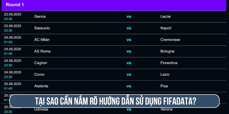 Fifadata giúp mọi người tiếp cận với một kho dữ liệu bóng đá chuyên sâu. Nắm được cách thao tác đơn giản sẽ giúp khách hàng tra cứu những thông tin cần tiết từ lịch thi đấu, tỷ số đến phân tích chiến thuật một cách nhanh chóng.